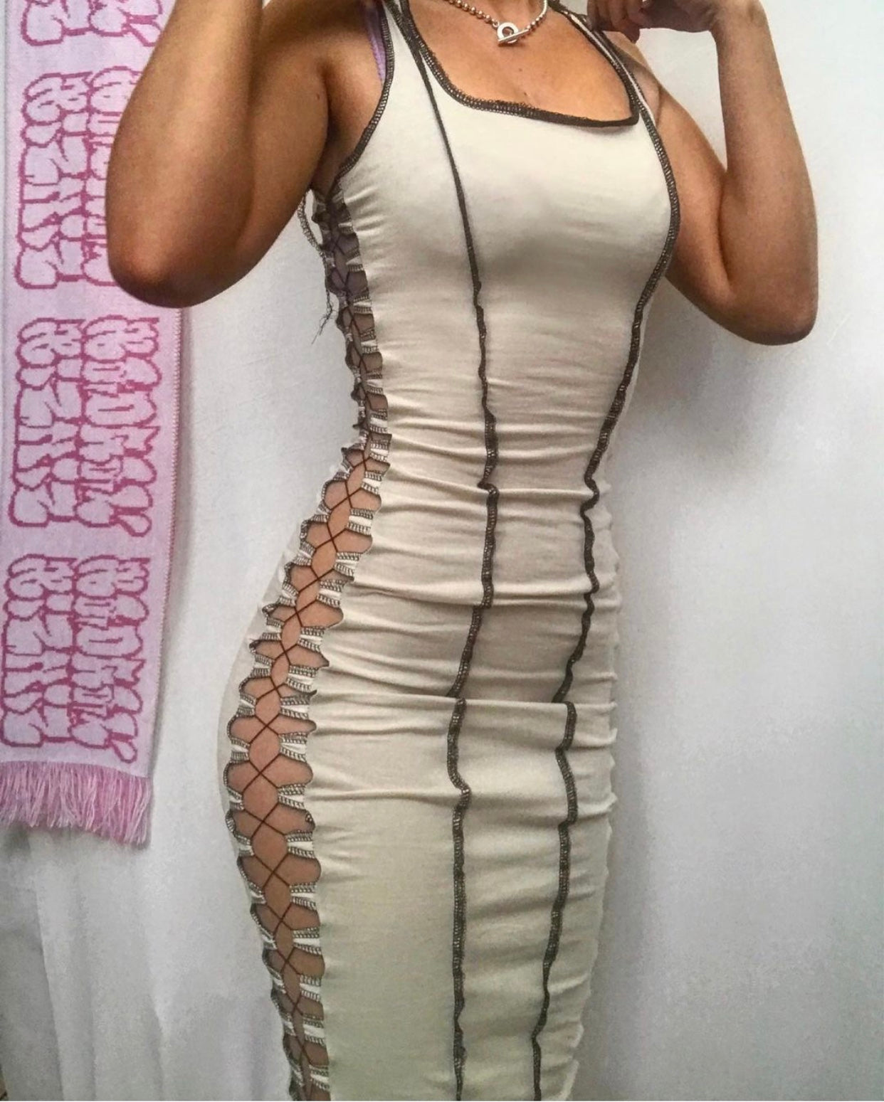 Cream sleeveless midi bodycon dress with full lace up detail on either sides. Finished with chocolate brown contrast stitch.