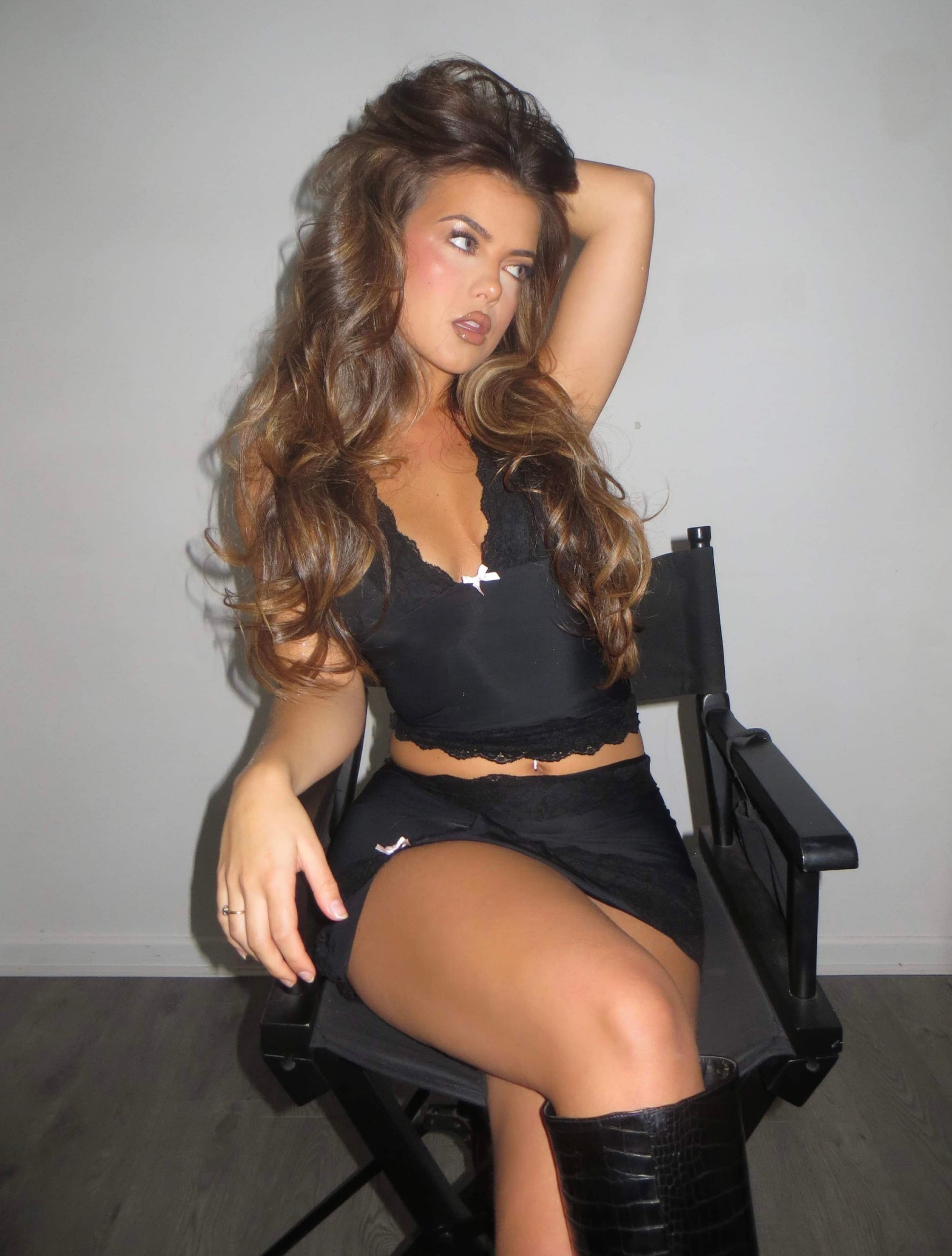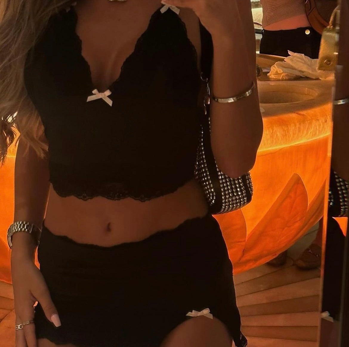 Black stretch halter neck top paired with black lace detailing and pink bow finishes.