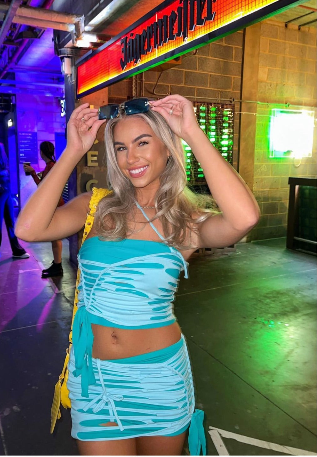 The ultimate summer set! Contrasting shades of blue in a cut and tie two piece set. Bandeau style top with matching skirt.