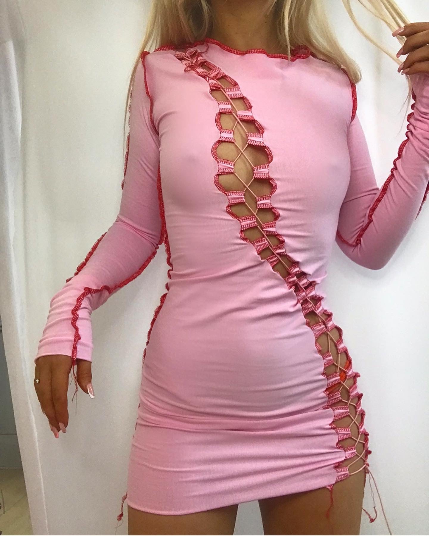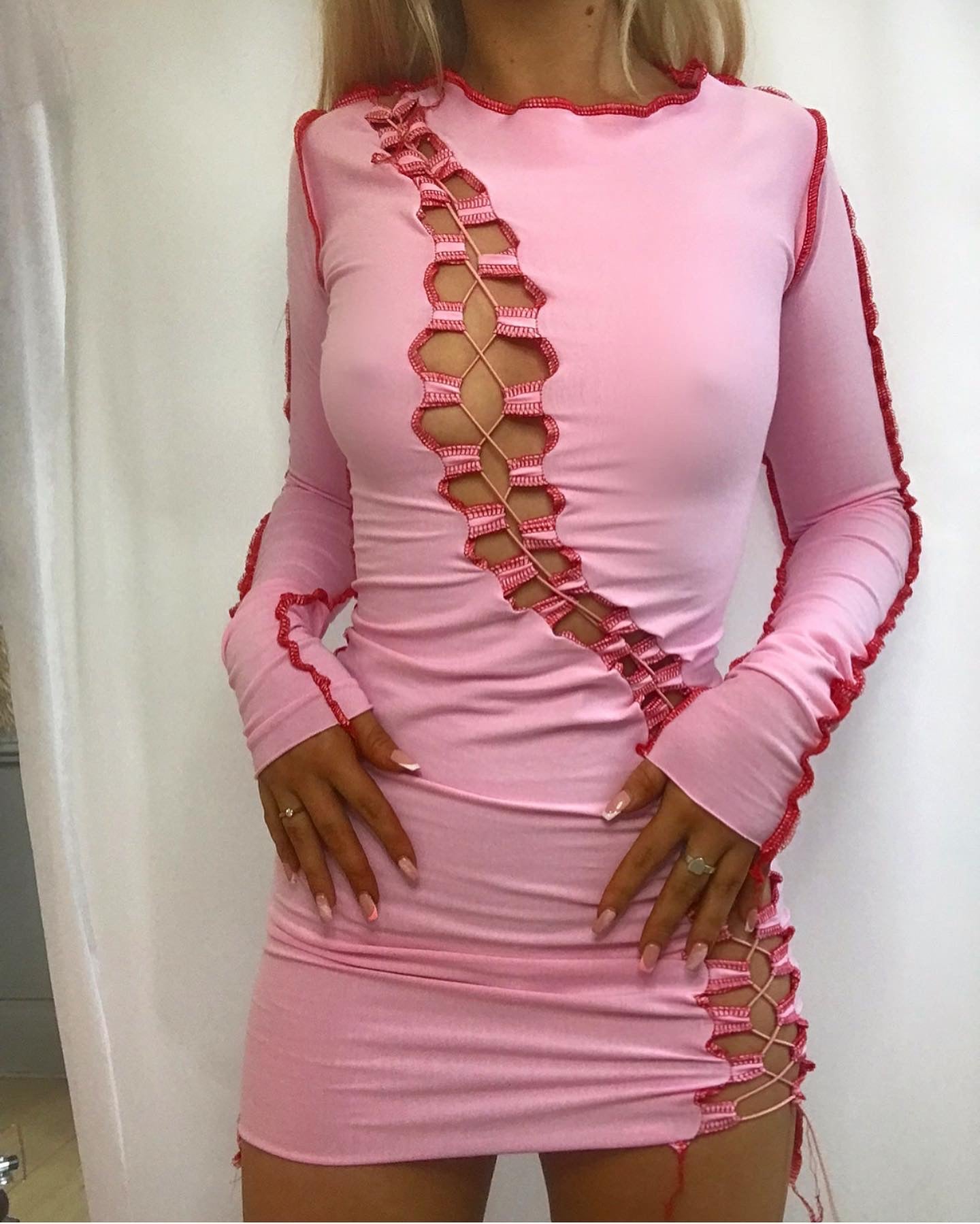 Barbie pink cotton stretch long sleeve bodycon dress with lace up swirl down the centre. Finished with red contrast stitch.