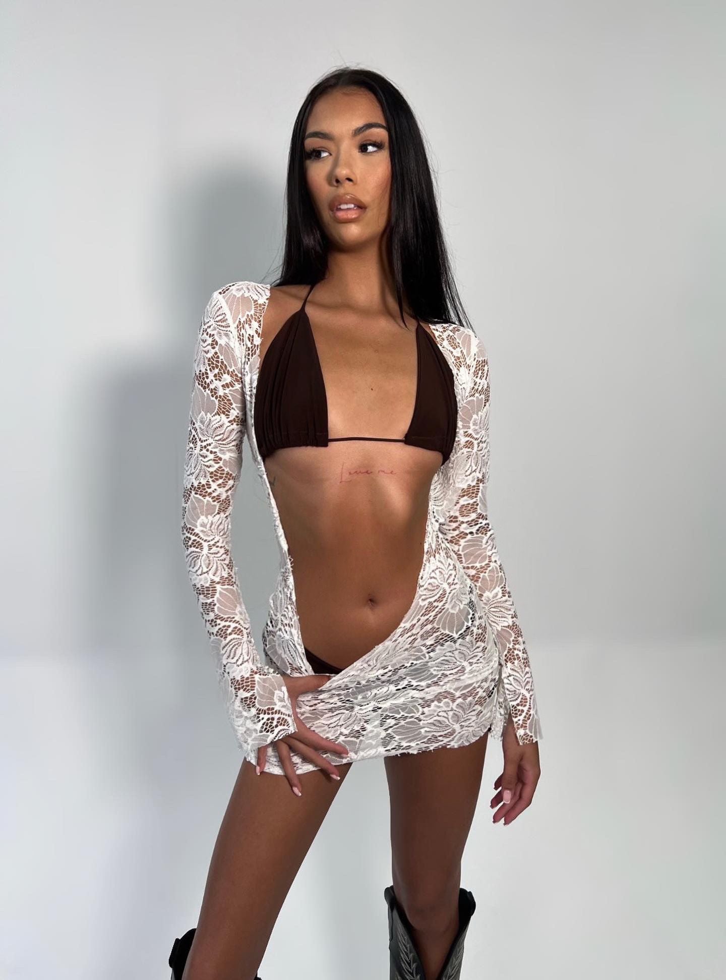 Don't you think it's hard to find the perfect chocolate brown shade bikini? Look no more! Double layered soft four way stretch chocolate brown triangle bikini set, with string tie finish.
