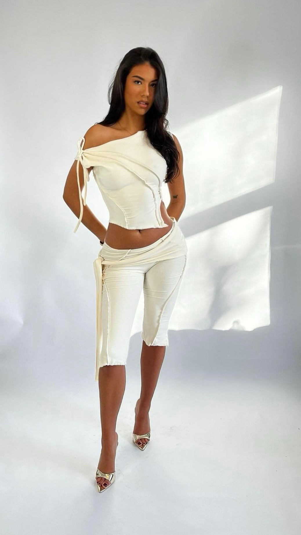 Cream cotton stretch capri pants and slouch top set. Featuring exposed seam tie waist and cut out hip top detailing.