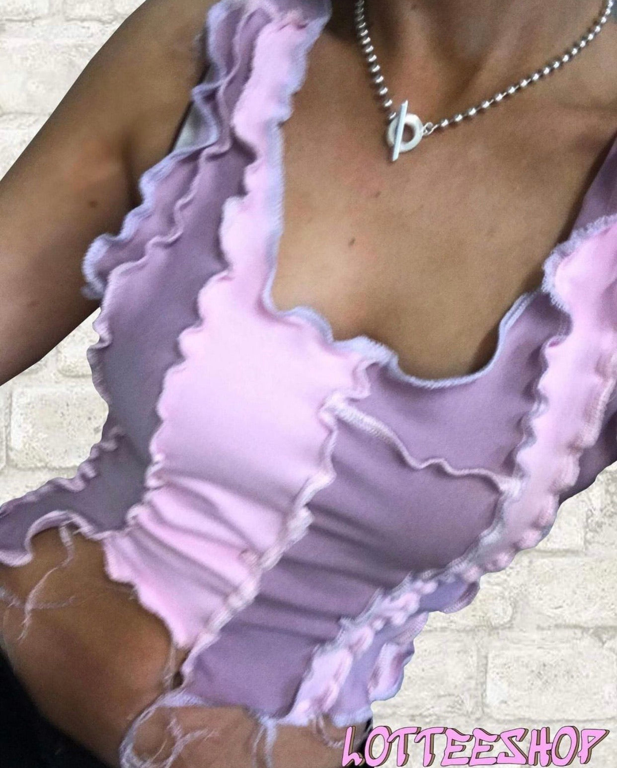 Baby pink and lilac patchwork vest top with extreme contrast stitches.
