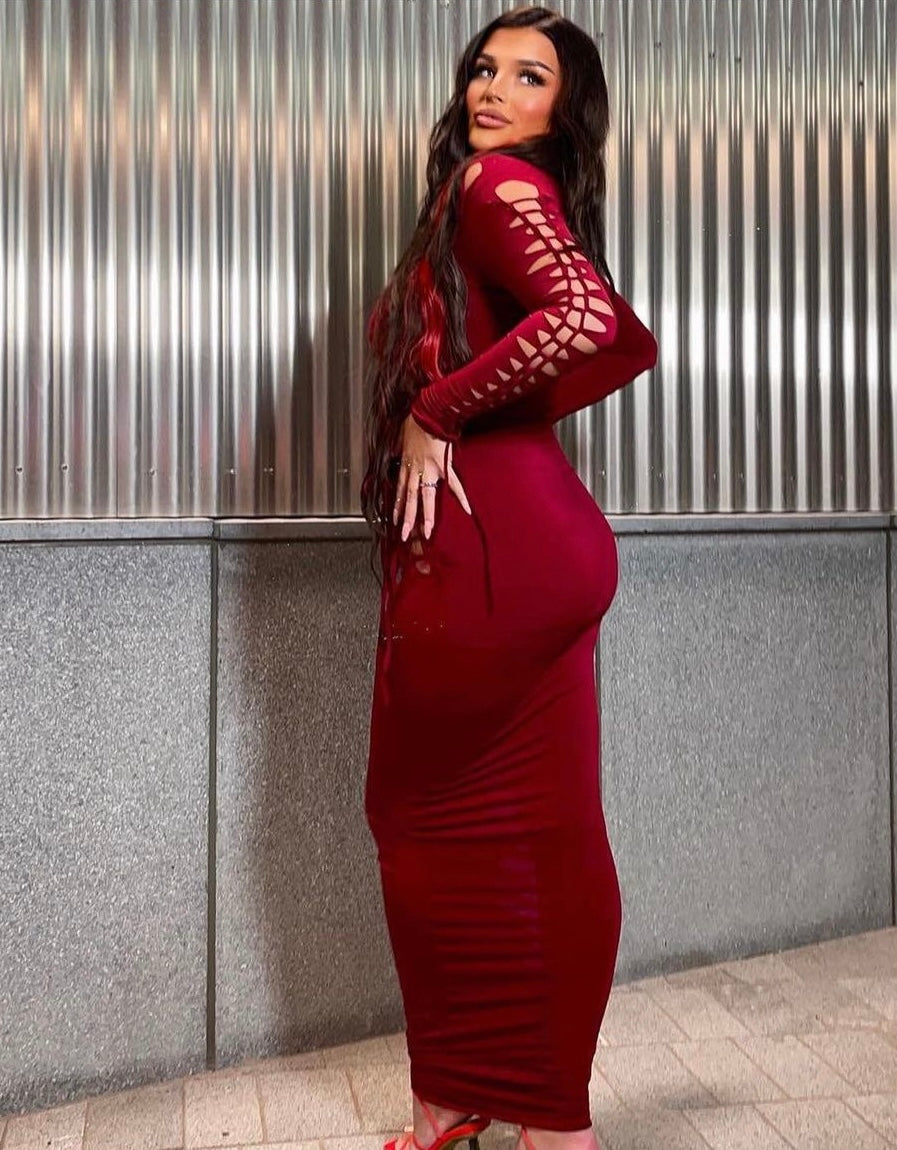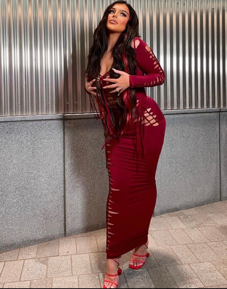 Wine red long sleeve bodysuit with matching maxi skirt. Includes cut and slash style finished with string tie detailing.