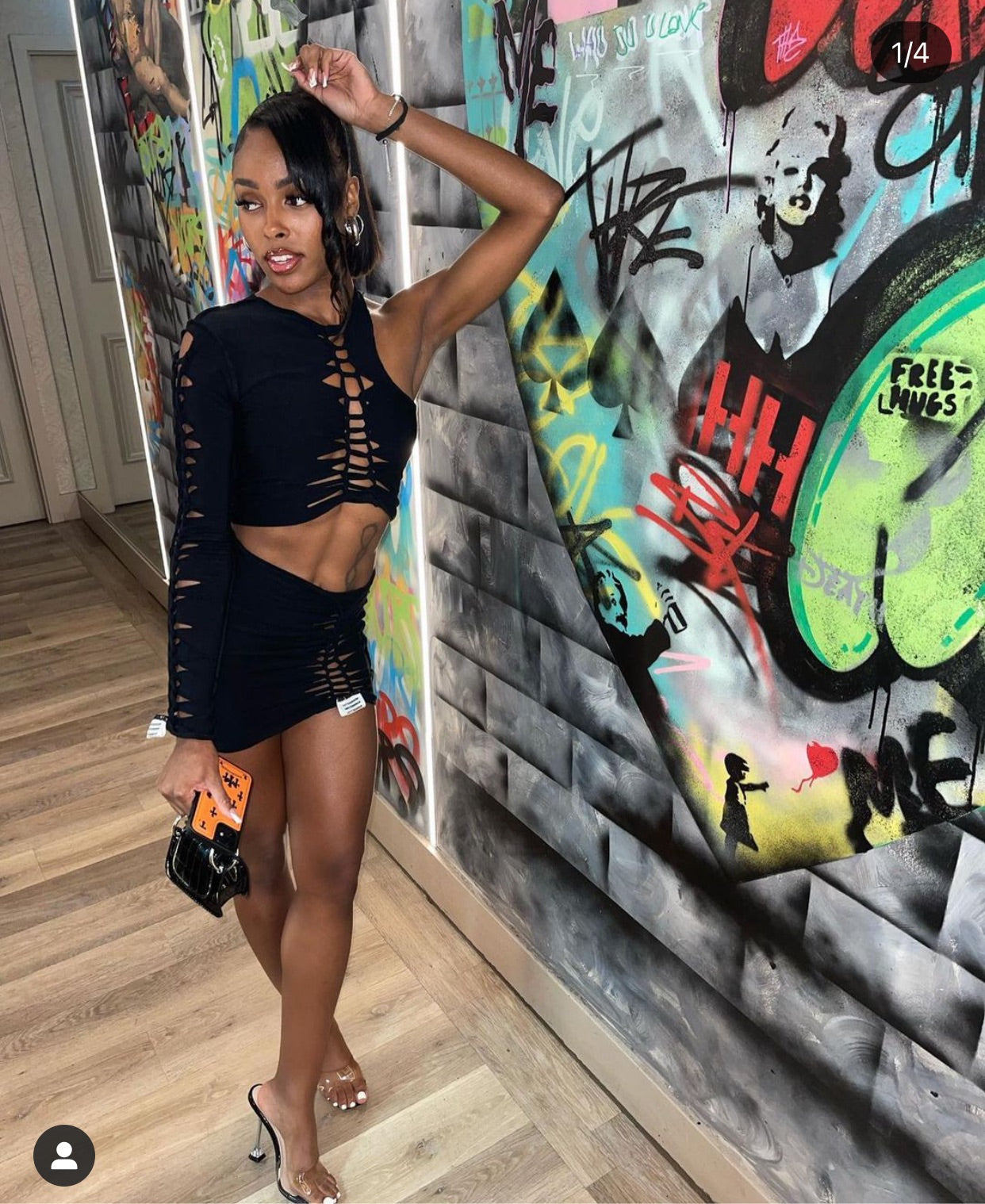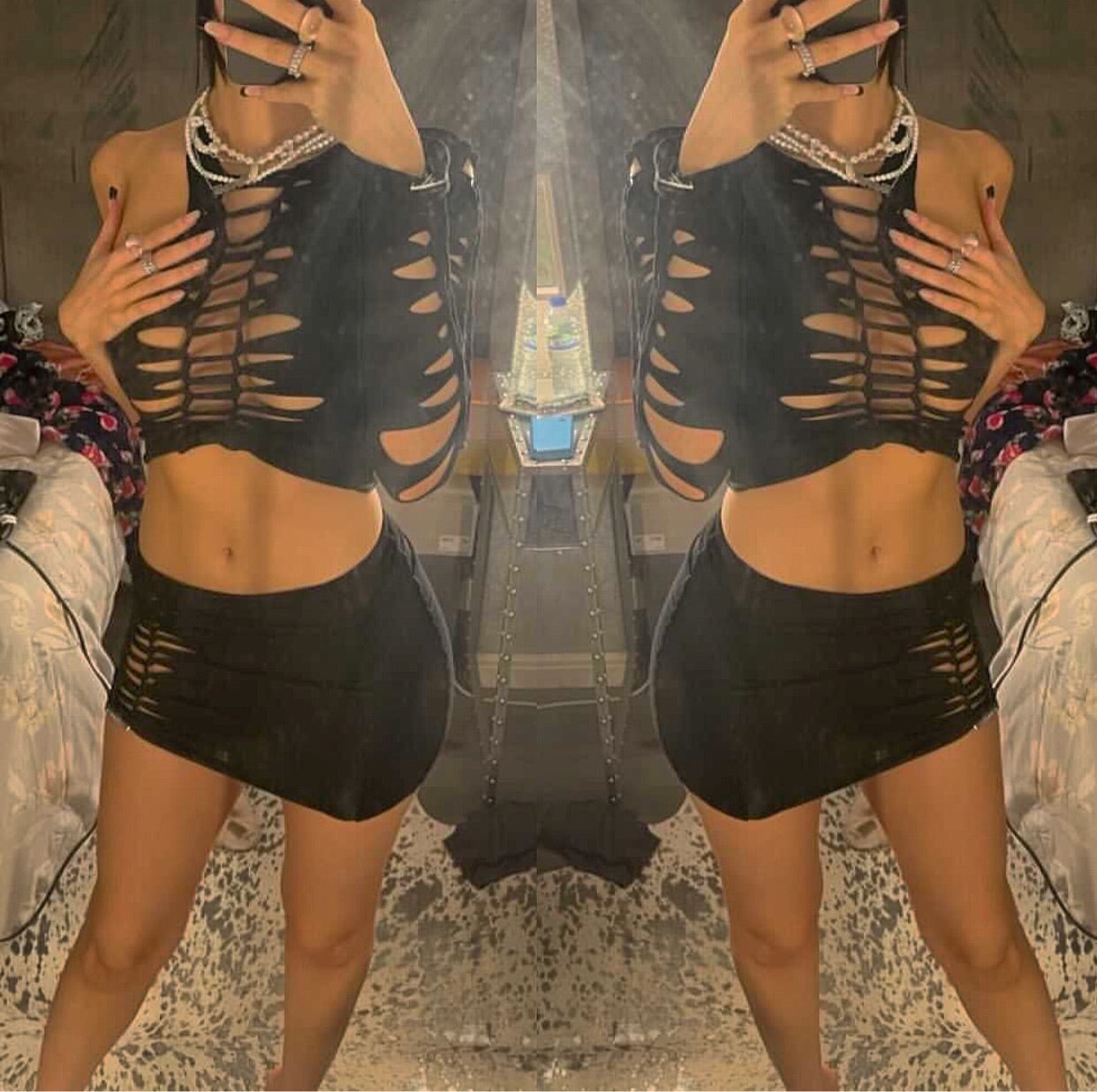 ICONIC LOTTEE Set! Cut and slash goodness in black. One Sleeve top with matching mini skirt.