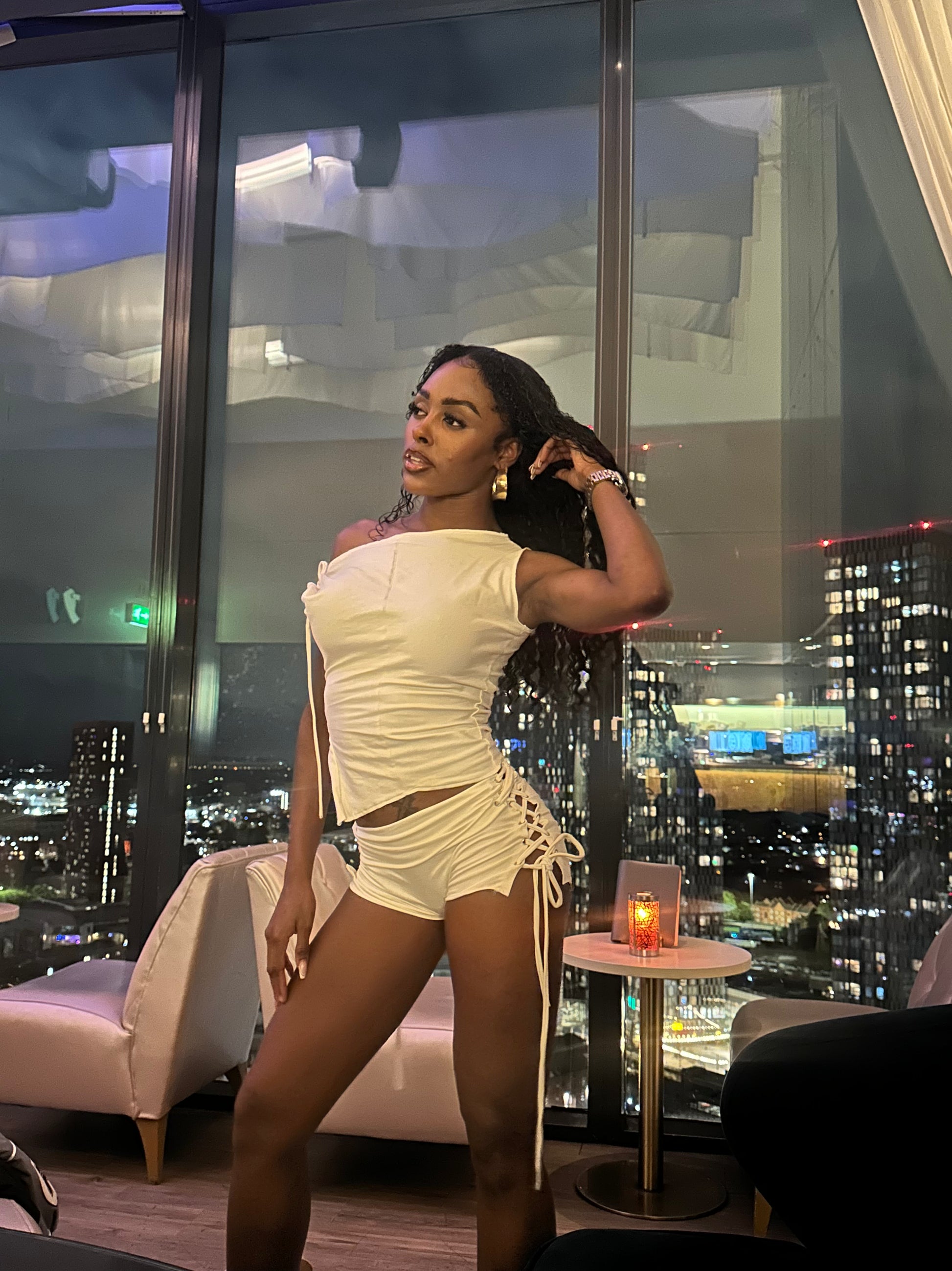 Off the shoulder asymmetric cream reversible top with tie detailing. - can be worn with exposed stitching. Paired with matching cream mini shorts with eyelet side hem detailing on both sides, finished with string ties and fold over waistline.