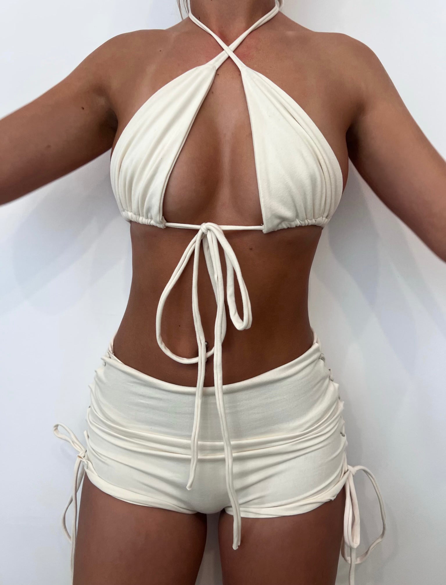 Creams for days! Cream cotton jersey triangle top with extreme front tie, paired with matching booty shorts including lace up side eyelet detailing. Can also be bought separately - check out Larna Triangle Top & Larna Shorts!