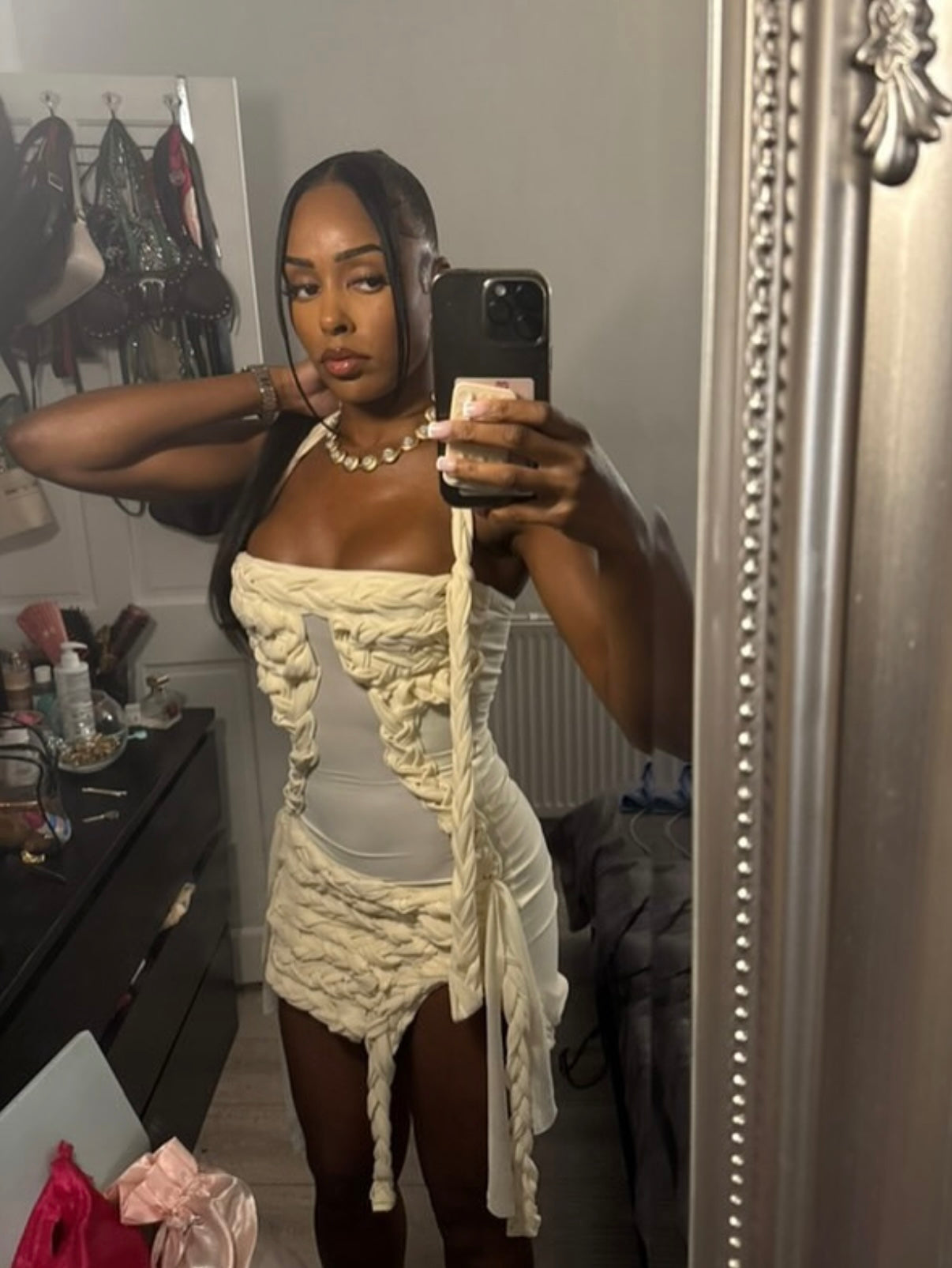 Miamis sister 🍨 double layered mesh stretch dress with hand plaited detailing.