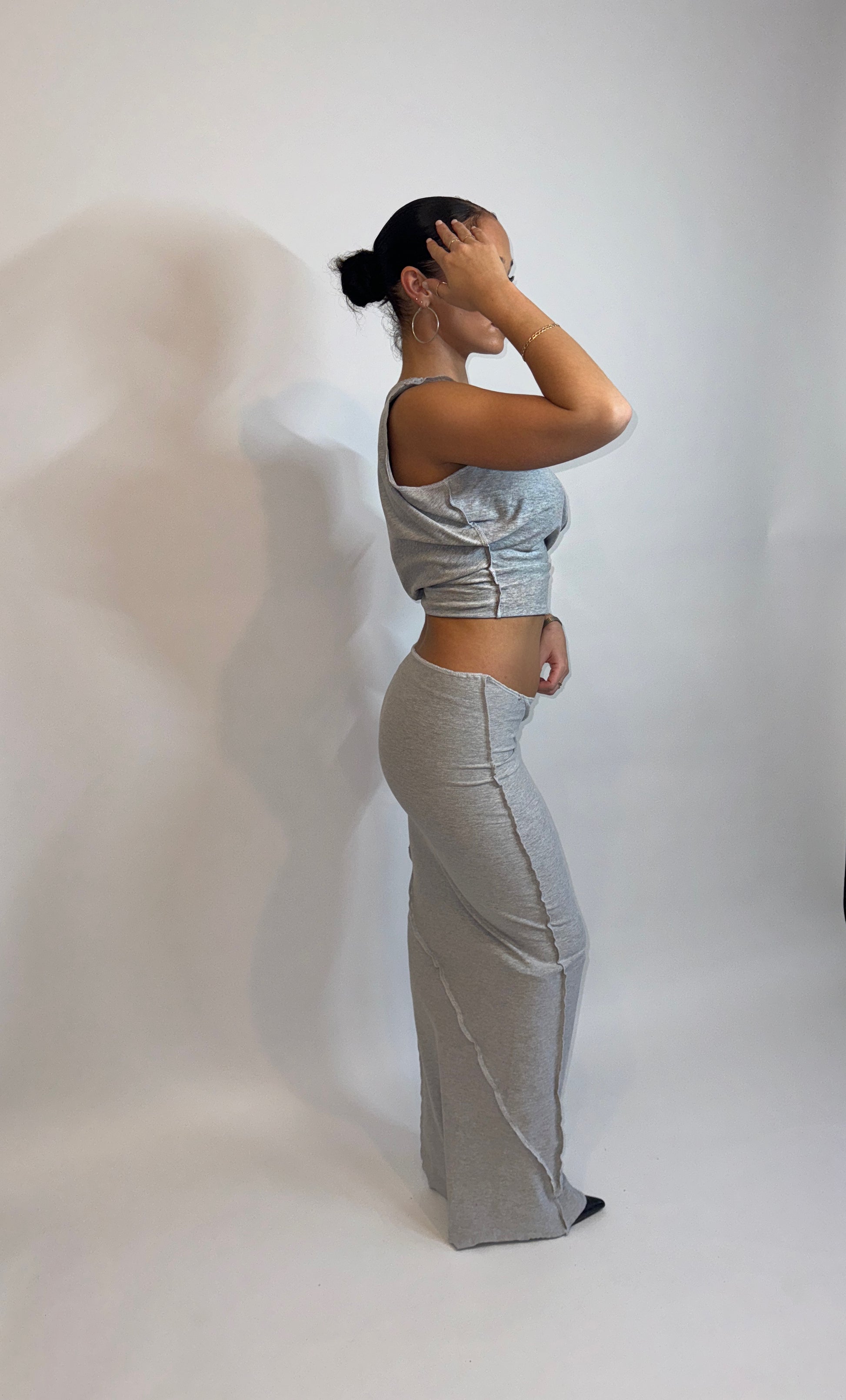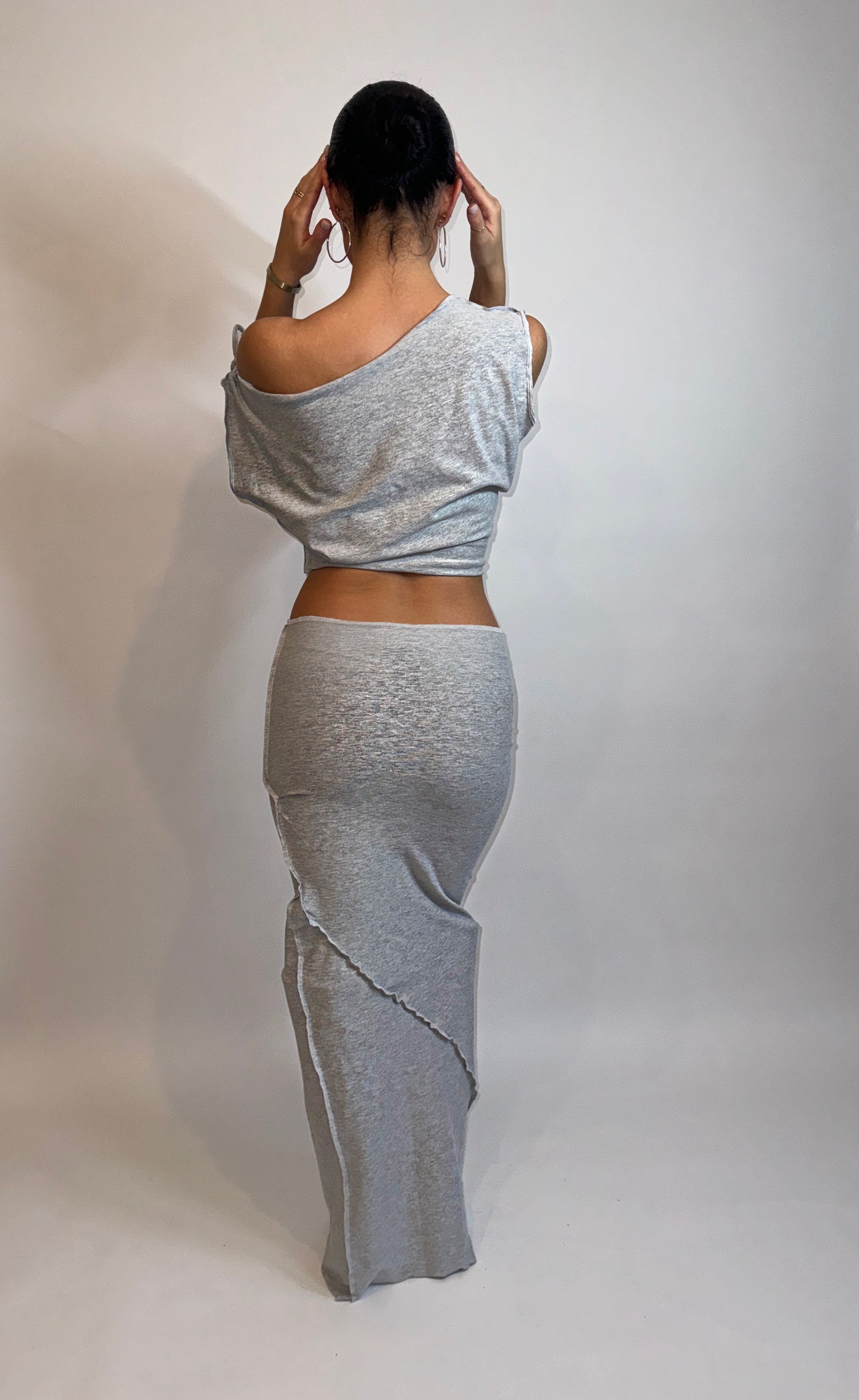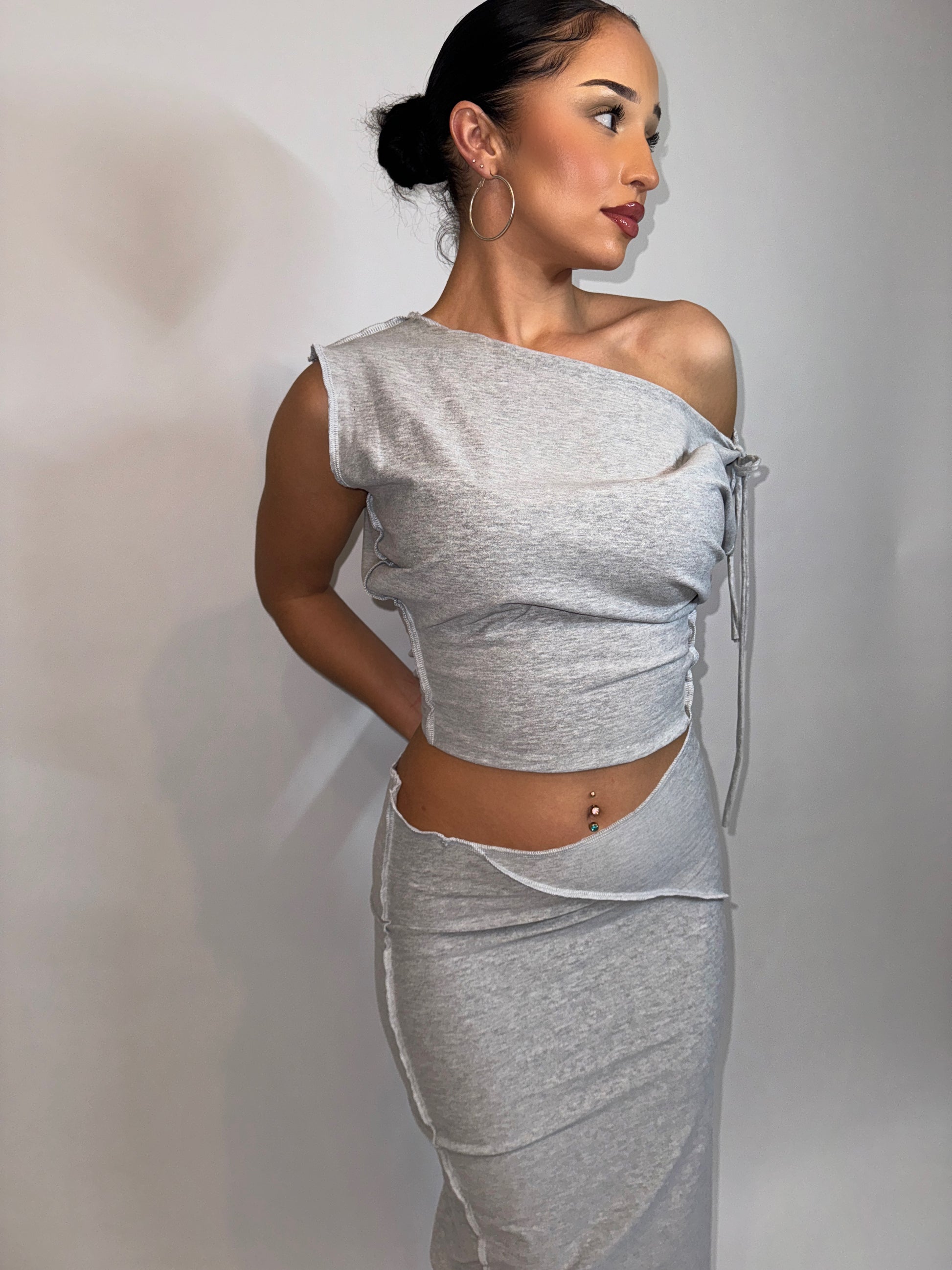 This set screams baddie! Includes grey marl off the shoulder slouch sleeveless top, paired with tight maxi skirt, featuring asymmetric stitching. Both finished with exposed seams throughout.