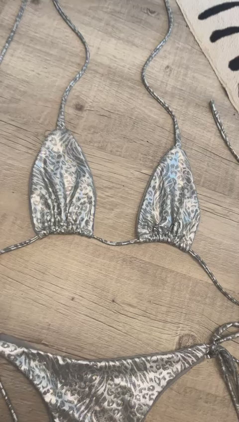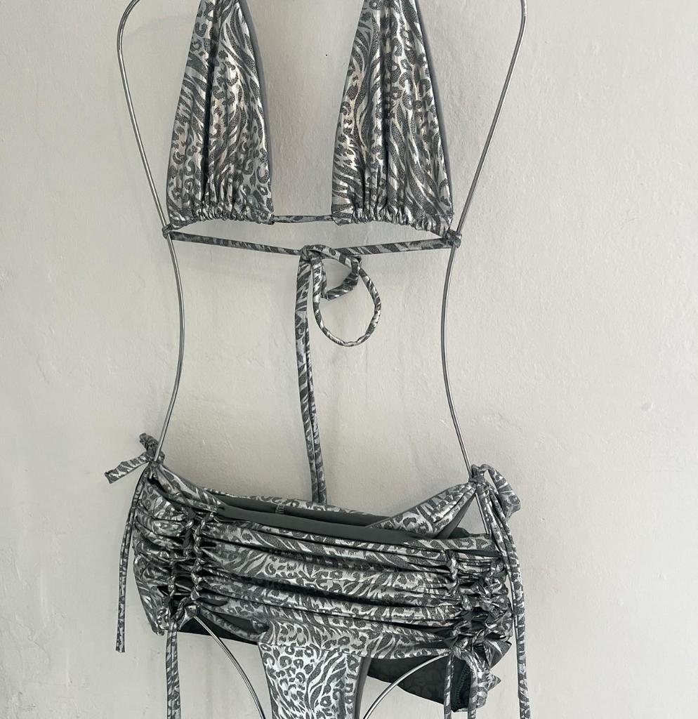 Our LOTTEE twist on metallic! Holographic double layered metallic silver bikini set with matching cut and slash skirt.