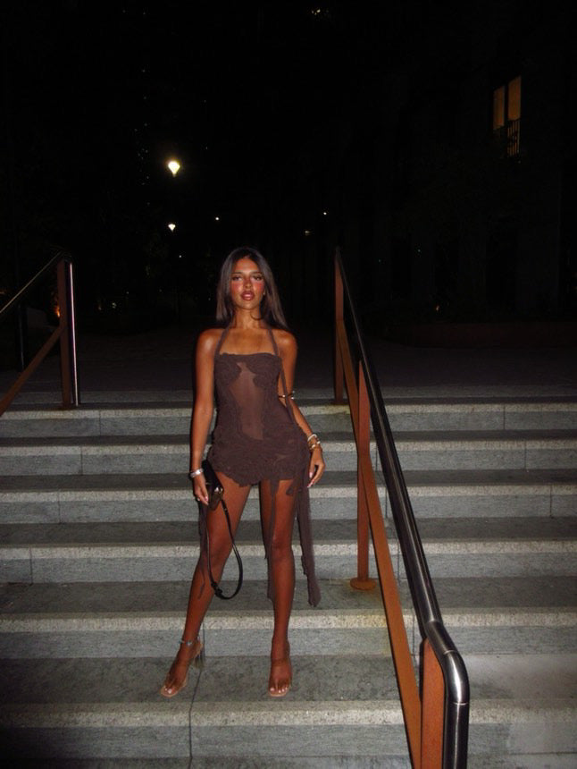 Chocolate brown mesh stretch dress made from strategically placed hand made platted material. This really is a special one that took weeks of sampling, time and love. Neck strap can be taken down and worn strapless. Back double layered.