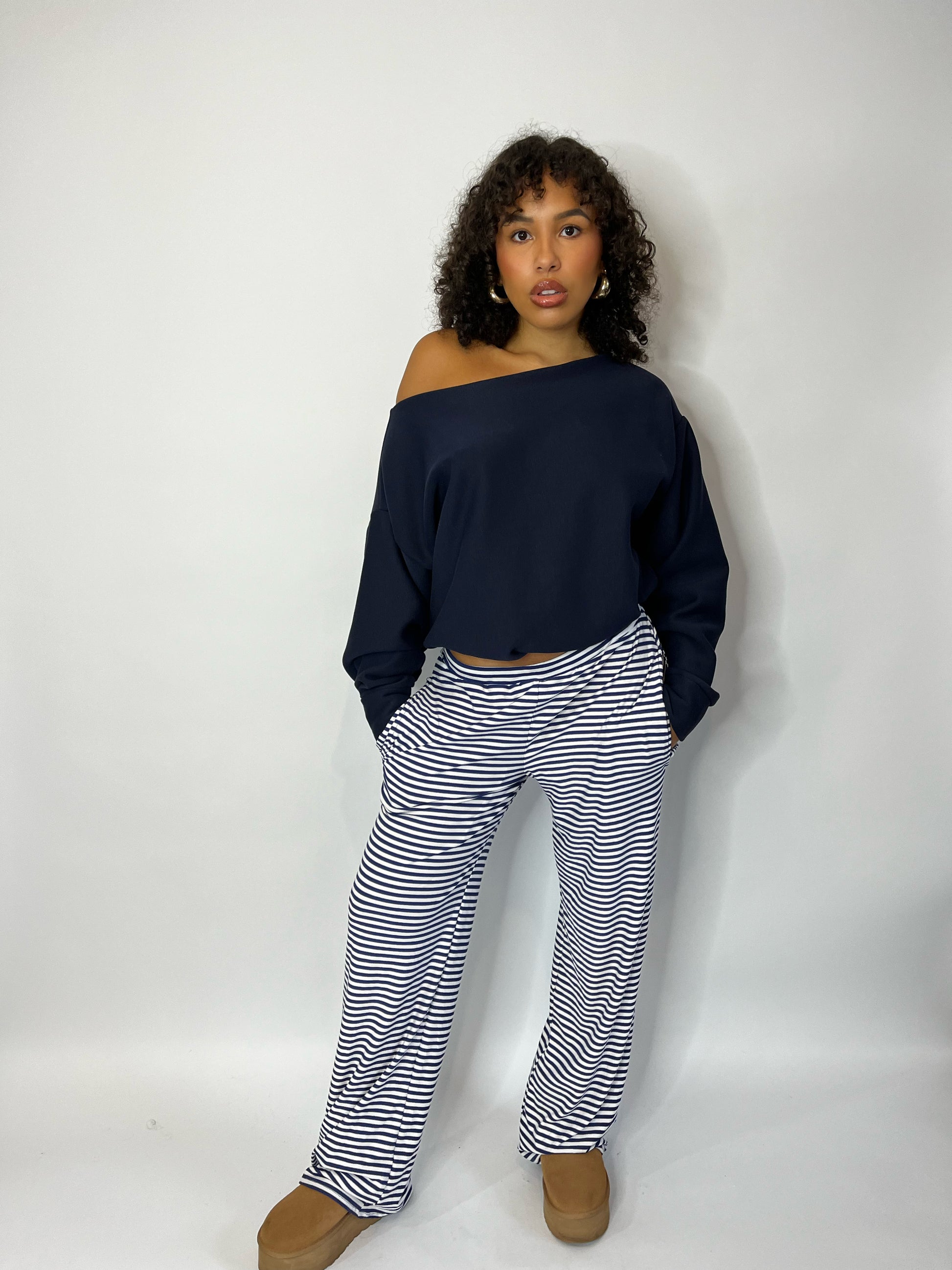 Cotton fleece with brushed inside off shoulder neck with cuffs and draw string waist tie.