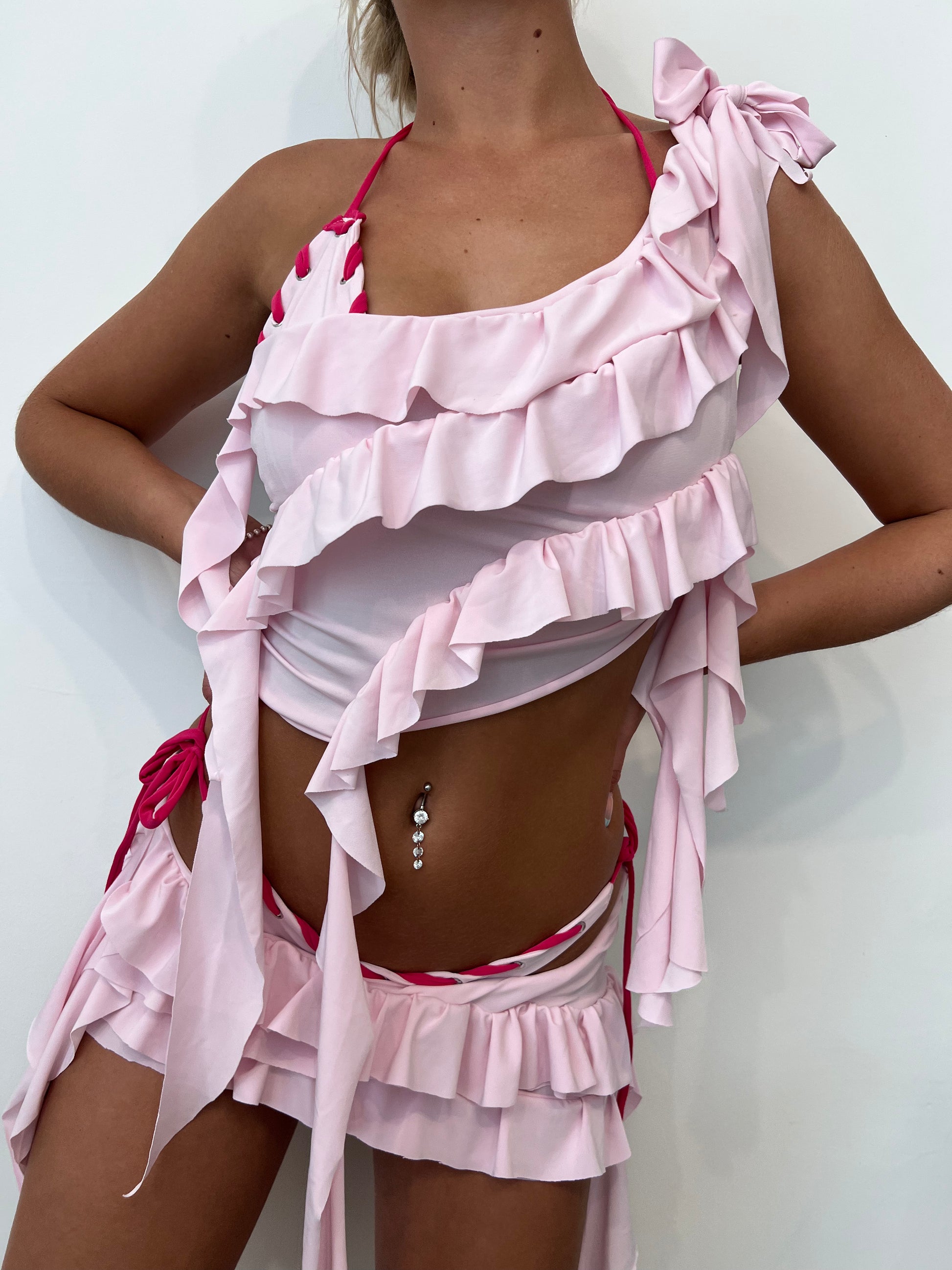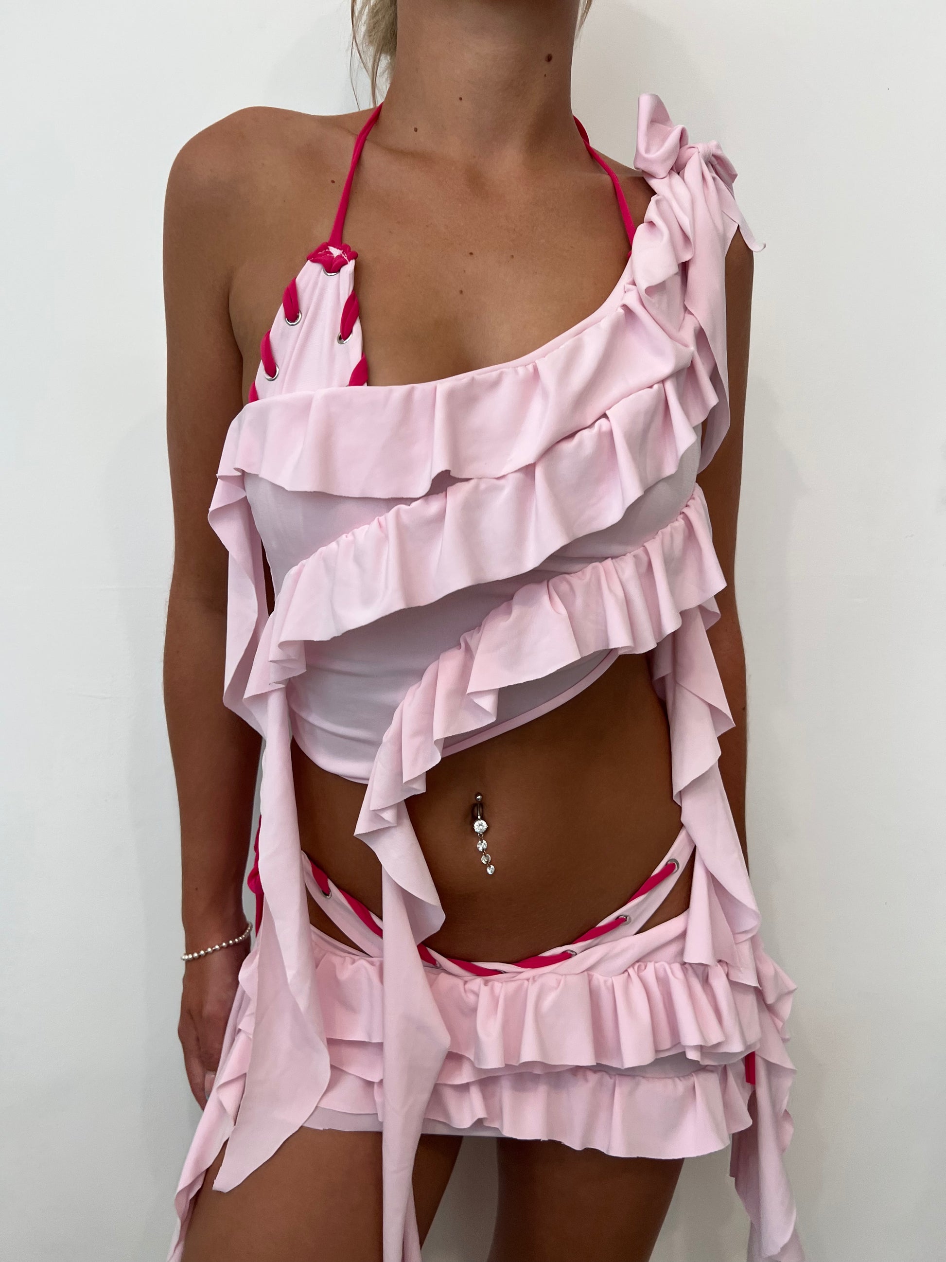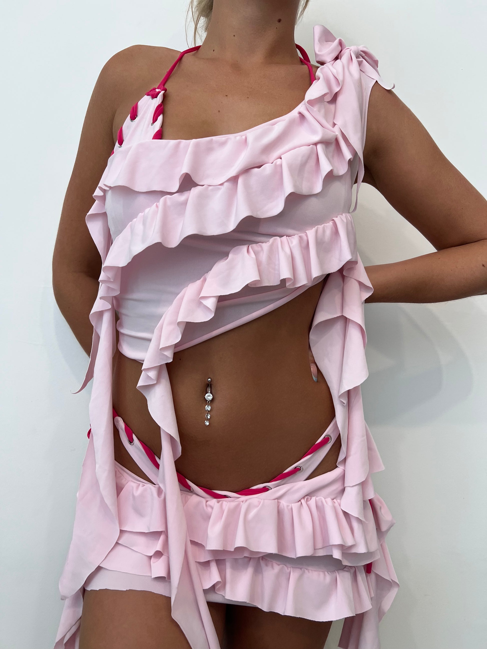 The ultimate ruffle top! Pink asymmetric stretch top with rows of ruffles throughout. Added tie under arm to make top crop for the extra look.