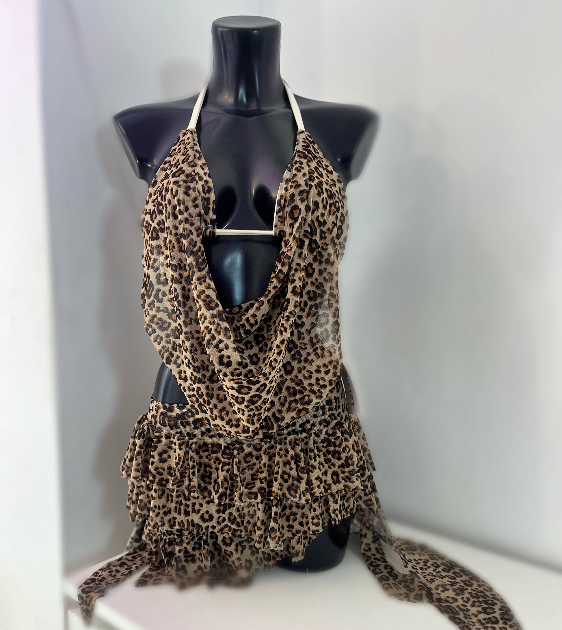 Leopard mesh and cream cotton triangle bra with drape mesh detailing. Paired with a mesh stretch ruffle skirt.
