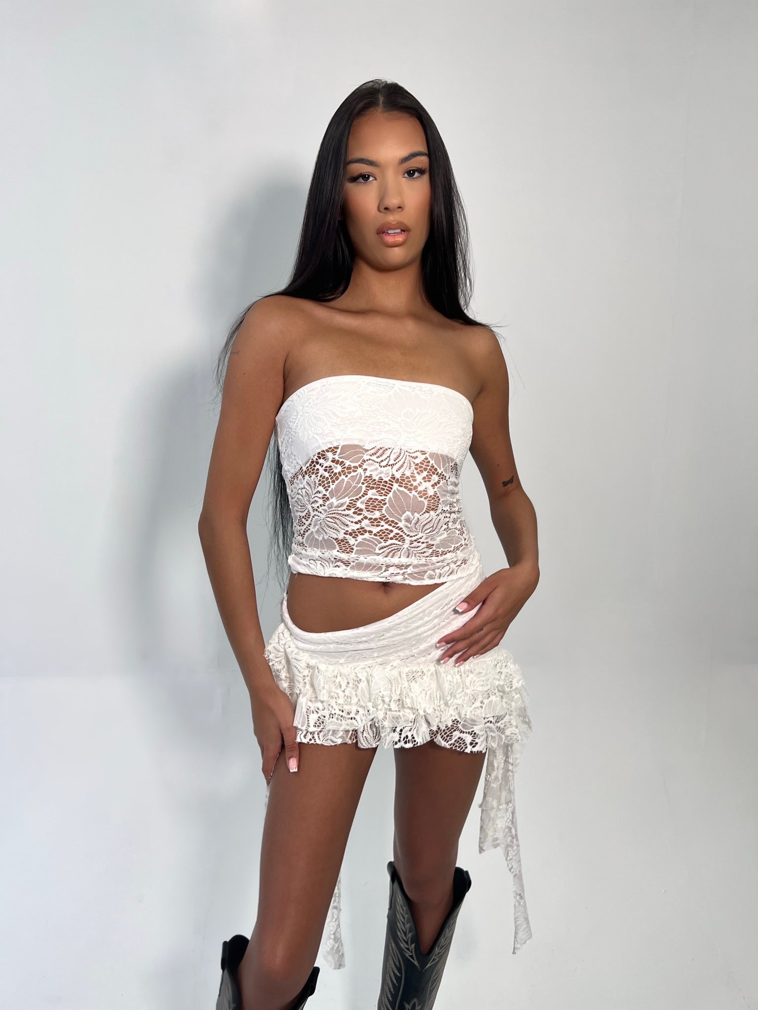 If you love the Soho Set, but you just fancy the skirt, we got you covered. Ivory stretch lace ruffle skirt. Stretch material mini skirt layered in multiple rows of ruffles including ivory lace draped down both sides of the skirt.