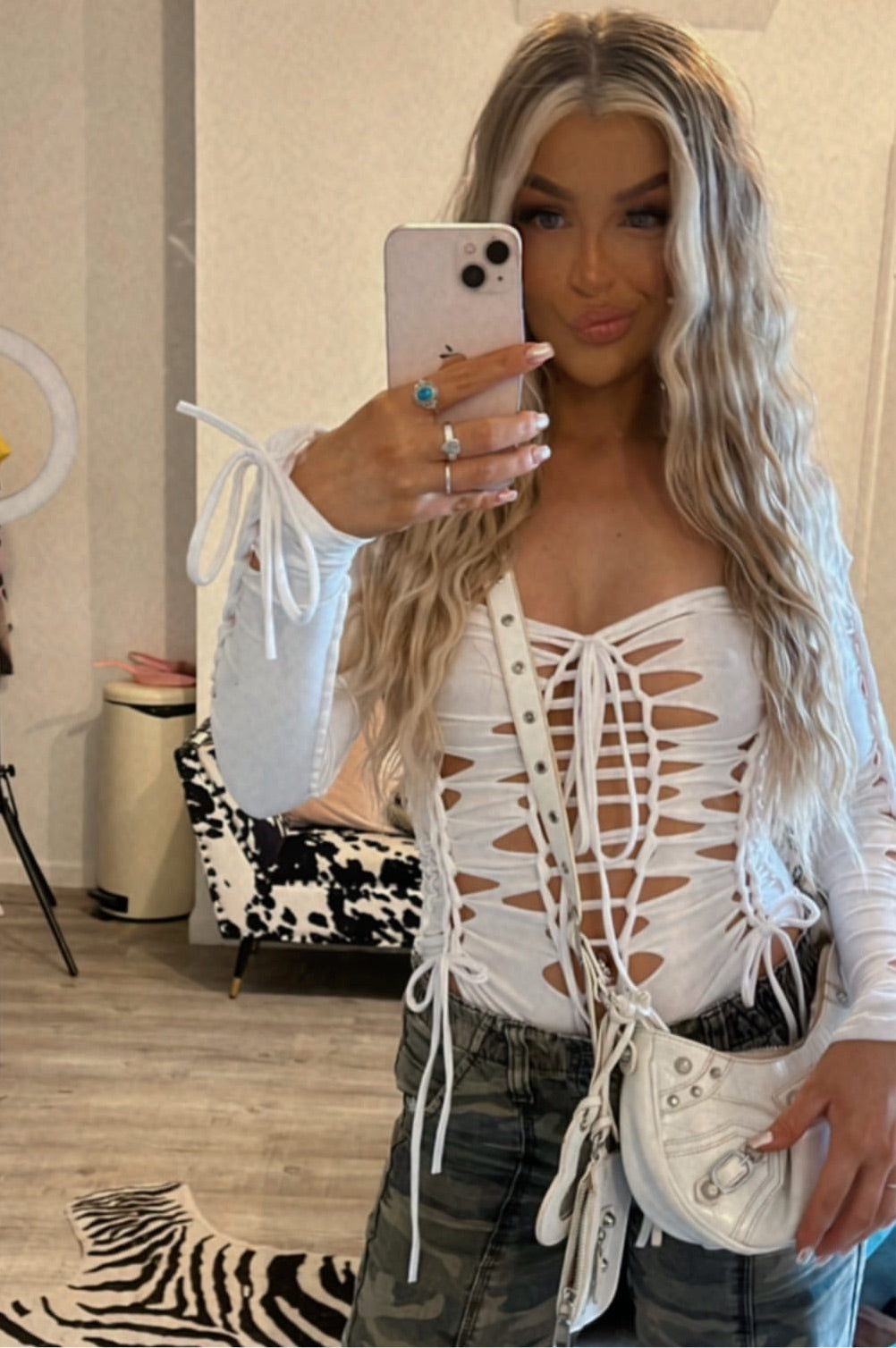 White cotton four way stretch long sleeve bodysuit. Finished with cut and slash lace up and tie detailing.